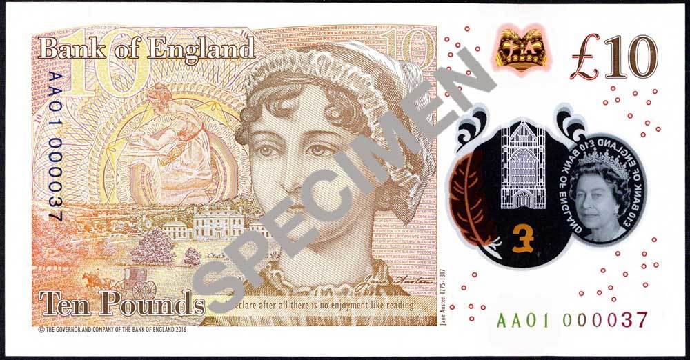 Bank of England, Victoria Cleland, £10 on polymer, ND (14 September 2017), serial number AA01 000037/38, orange-brown, Queen Elizabeth II at right, transparent window at left with portrait of the Queen and view of Winchester Cathedral, the latter highlighted in gold. To the right of Winchester Cathedral is a quill, which shows as orange or purple depending on angle of view. Reverse orange-brown, a portrait of Jane Austen. To her left is an illustration of Elizabeth Bennet, the central character in 'Pride and Prejudice'. A foil silver image at left depicts Winchester Cathedral