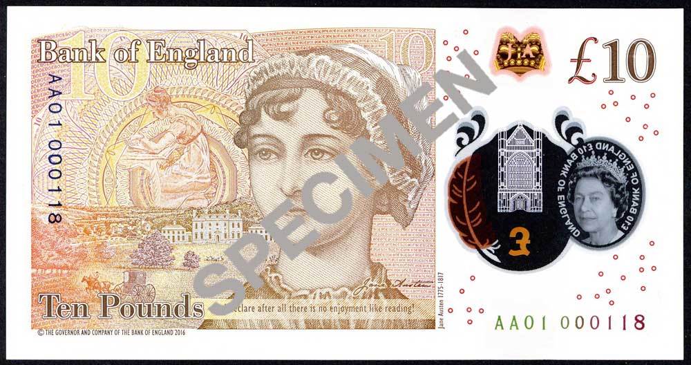 Bank of England, Victoria Cleland, £10 on polymer, ND (14 September 2017), serial number AA01 000118/119, orange-brown, Queen Elizabeth II at right, transparent window at left with portrait of the Queen and view of Winchester Cathedral, the latter highlighted in gold. To the right of Winchester Cathedral is a quill, which shows as orange or purple depending on angle of view. Reverse orange-brown, a portrait of Jane Austen. To her left is an illustration of Elizabeth Bennet, the central character in 'Pride and Prejudice'. A foil silver image at left depicts Winchester Cathedral