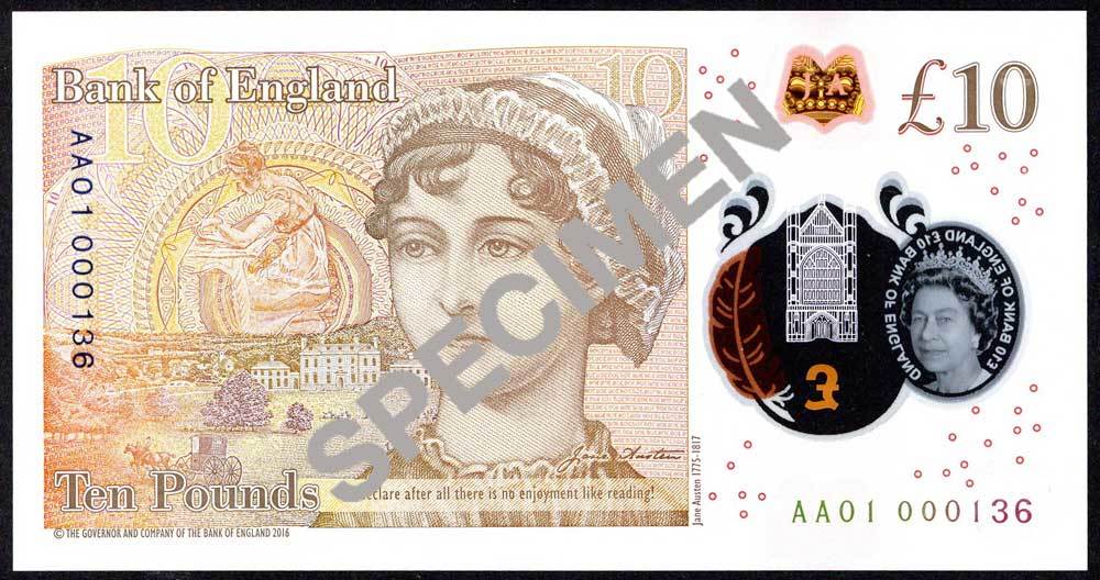Bank of England, Victoria Cleland, £10 on polymer, ND (14 September 2017), serial number AA01 000136/137/138, orange-brown, Queen Elizabeth II at right, transparent window at left with portrait of the Queen and view of Winchester Cathedral, the latter highlighted in gold. To the right of Winchester Cathedral is a quill, which shows as orange or purple depending on angle of view. Reverse orange-brown, a portrait of Jane Austen. To her left is an illustration of Elizabeth Bennet, the central character in 'Pride and Prejudice'. A foil silver image at left depicts Winchester Cathedral