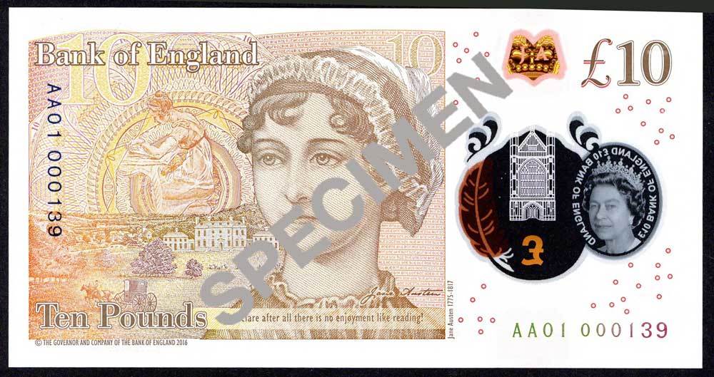 Bank of England, Victoria Cleland, £10 on polymer, ND (14 September 2017), serial number AA01 000139/140/141, orange-brown, Queen Elizabeth II at right, transparent window at left with portrait of the Queen and view of Winchester Cathedral, the latter highlighted in gold. To the right of Winchester Cathedral is a quill, which shows as orange or purple depending on angle of view. Reverse orange-brown, a portrait of Jane Austen. To her left is an illustration of Elizabeth Bennet, the central character in 'Pride and Prejudice'. A foil silver image at left depicts Winchester Cathedral