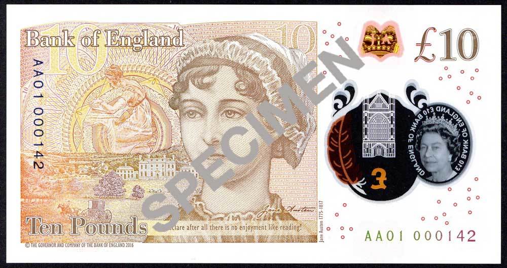 Bank of England, Victoria Cleland, £10 on polymer, ND (14 September 2017), serial number AA01 000142/143/144, orange-brown, Queen Elizabeth II at right, transparent window at left with portrait of the Queen and view of Winchester Cathedral, the latter highlighted in gold. To the right of Winchester Cathedral is a quill, which shows as orange or purple depending on angle of view. Reverse orange-brown, a portrait of Jane Austen. To her left is an illustration of Elizabeth Bennet, the central character in 'Pride and Prejudice'. A foil silver image at left depicts Winchester Cathedral