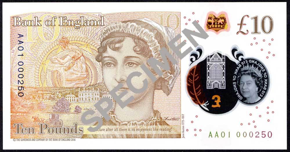 Bank of England, Victoria Cleland, £10 on polymer, ND (14 September 2017), serial number AA01 000250, orange-brown, Queen Elizabeth II at right, transparent window at left with portrait of the Queen and view of Winchester Cathedral, the latter highlighted in gold. To the right of Winchester Cathedral is a quill, which shows as orange or purple depending on angle of view. Reverse orange-brown, a portrait of Jane Austen. To her left is an illustration of Elizabeth Bennet, the central character in 'Pride and Prejudice'. A foil silver image at left depicts Winchester Cathedral