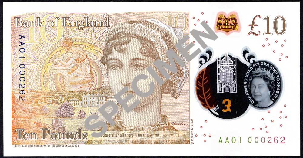 Bank of England, Victoria Cleland, £10 on polymer, ND (14 September 2017), serial number AA01 000262/263, orange-brown, Queen Elizabeth II at right, transparent window at left with portrait of the Queen and view of Winchester Cathedral, the latter highlighted in gold. To the right of Winchester Cathedral is a quill, which shows as orange or purple depending on angle of view. Reverse orange-brown, a portrait of Jane Austen. To her left is an illustration of Elizabeth Bennet, the central character in 'Pride and Prejudice'. A foil silver image at left depicts Winchester Cathedral