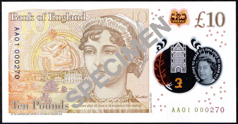 Bank of England, Victoria Cleland, £10 on polymer, ND (14 September 2017), serial number AA01 000270, orange-brown, Queen Elizabeth II at right, transparent window at left with portrait of the Queen and view of Winchester Cathedral, the latter highlighted in gold. To the right of Winchester Cathedral is a quill, which shows as orange or purple depending on angle of view. Reverse orange-brown, a portrait of Jane Austen. To her left is an illustration of Elizabeth Bennet, the central character in 'Pride and Prejudice'. A foil silver image at left depicts Winchester Cathedral