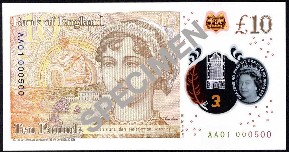 Bank of England, Victoria Cleland, £10 on polymer, ND (14 September 2017), serial number AA01 000500, orange-brown, Queen Elizabeth II at right, transparent window at left with portrait of the Queen and view of Winchester Cathedral, the latter highlighted in gold. To the right of Winchester Cathedral is a quill, which shows as orange or purple depending on angle of view. Reverse orange-brown, a portrait of Jane Austen. To her left is an illustration of Elizabeth Bennet, the central character in 'Pride and Prejudice'. A foil silver image at left depicts Winchester Cathedral