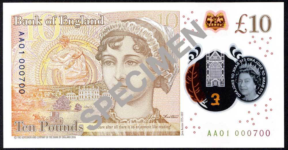 Bank of England, Victoria Cleland, £10 on polymer, ND (14 September 2017), serial number AA01 000700, orange-brown, Queen Elizabeth II at right, transparent window at left with portrait of the Queen and view of Winchester Cathedral, the latter highlighted in gold. To the right of Winchester Cathedral is a quill, which shows as orange or purple depending on angle of view. Reverse orange-brown, a portrait of Jane Austen. To her left is an illustration of Elizabeth Bennet, the central character in 'Pride and Prejudice'. A foil silver image at left depicts Winchester Cathedral