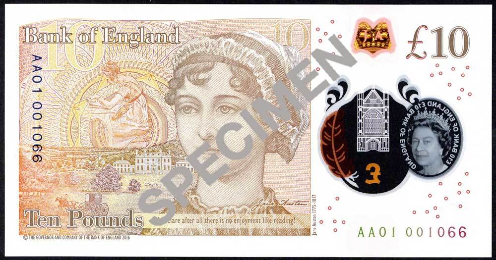 Bank of England, Victoria Cleland, £10 on polymer, ND (14 September 2017), serial number AA01 001066, orange-brown, Queen Elizabeth II at right, transparent window at left with portrait of the Queen and view of Winchester Cathedral, the latter highlighted in gold. To the right of Winchester Cathedral is a quill, which shows as orange or purple depending on angle of view. Reverse orange-brown, a portrait of Jane Austen. To her left is an illustration of Elizabeth Bennet, the central character in 'Pride and Prejudice'. A foil silver image at left depicts Winchester Cathedral