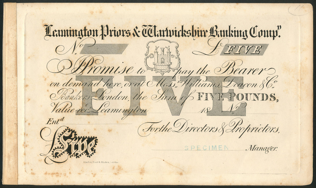 Leamington Priors & Warwickshire Banking Company, proof £5 on card, 18- (1835-1880), black and white, value at lower left, right, top right, and centre as protector in grey, seal at top left
