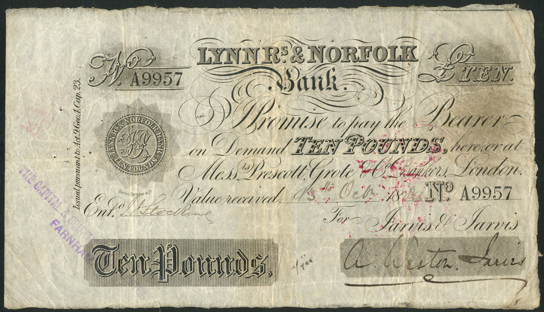 Lynn Regis & Norfolk Bank (Jarvis & Jarvis), £10, 13 October 1884, serial number A9957, black and white, value at low left and top right, partnership initials at left, manuscript signature of L.Weston Jarvis at low right, value on reverse in brown