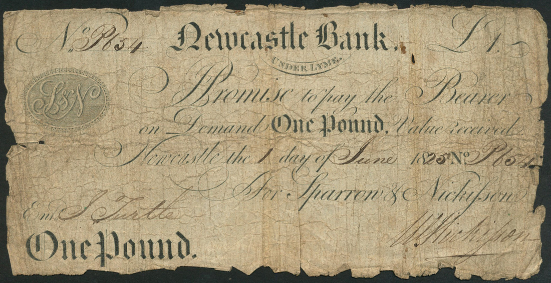 Newcastle Bank (Sparrow & Nickisson), £1, 1 June 1825, serial number P654, black and white, value at lower left, centre and top right, bankers' initials at top left, manuscript signature at lower right, revenue stamp on reverse in black and red