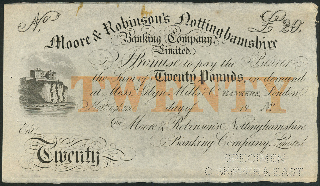 Moore & Robinson's Nottinghamshire Banking Company Limited, specimen £20, Nottingham 18- (circa 1870), large country house on hilltop at left, black, value in pale orange underprint,