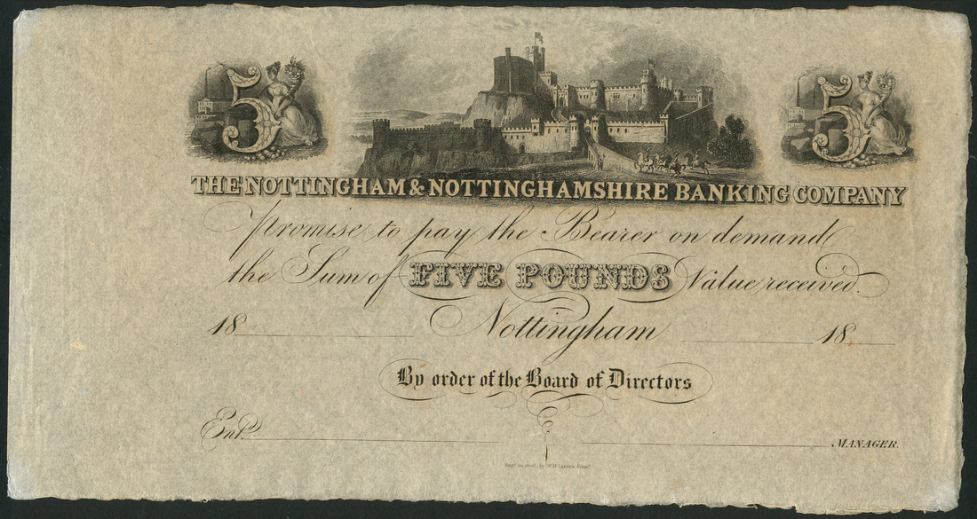 The Nottingham & Nottinghamshire Bank Company, an unissued £5, 18-, no serial number, black and white on watermarked paper, value at centre and top right and top left, allegorical maiden, value, cornucopia and industrial scene, a beautiful vignette of Nottingham Castle at top centre, printed by W. H. Lizars