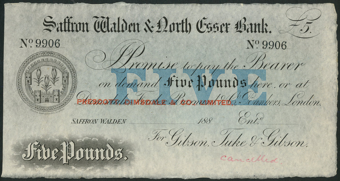 Saffron Waldon & North Essex Bank, specimen £5, 188-, serial number 9906, black and white, value in blue underprint at centre, arms at left, for Gibson, Tuke and Gibson, red overprint at centre Prescott, Dimsdale & Co. Limited, Blades, East & Blades engraving