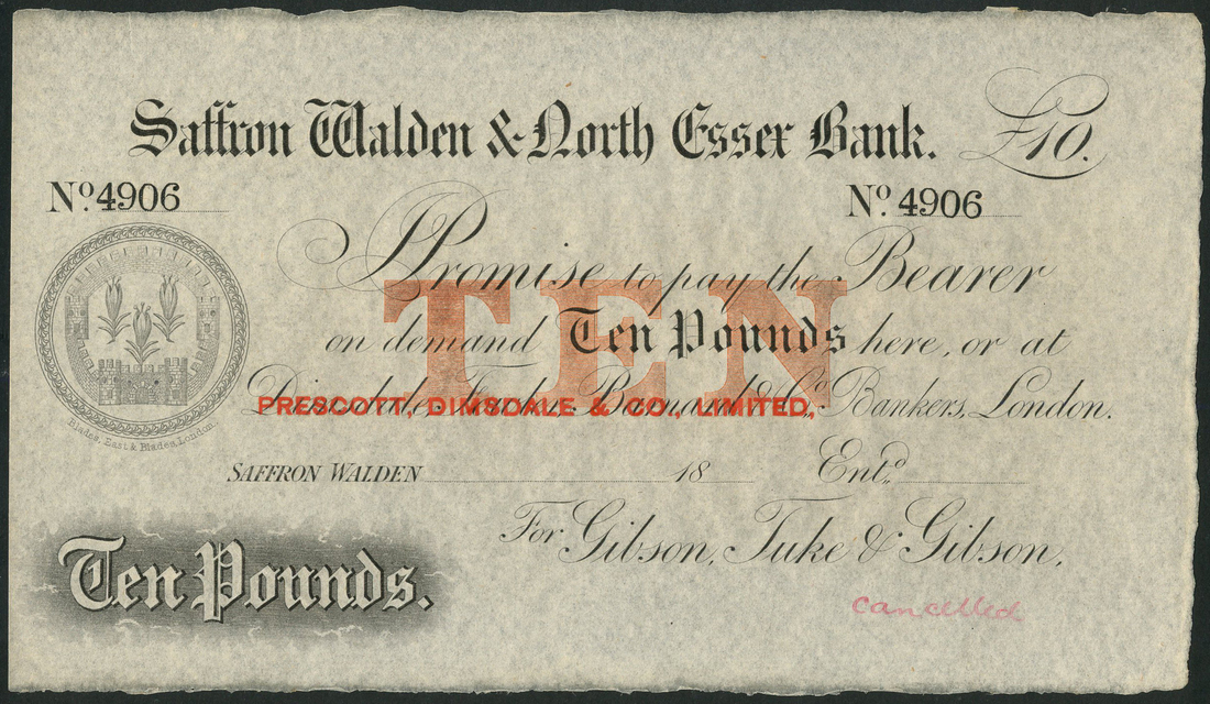 Saffron Waldon & North Essex Bank, specimen £10, 18--, serial number 4906, black and white, value in blue underprint at centre, arms at left, for Gibson, Tuke and Gibson, red overprint at centre Prescott, Dimsdale & Co. Limited, Blades, East & Blades engraving