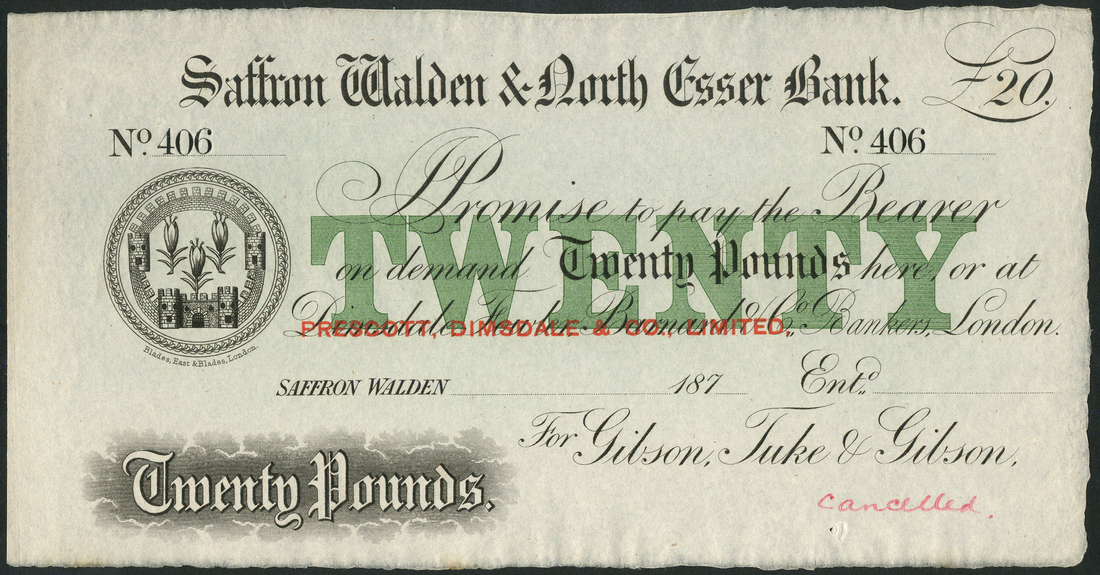 Saffron Waldon & North Essex Bank, specimen £20, 187-, serial number 406, black and white, value in blue underprint at centre, arms at left, for Gibson, Tuke and Gibson, red overprint at centre Prescott, Dimsdale & Co. Limited, Blades, East & Blades engraving