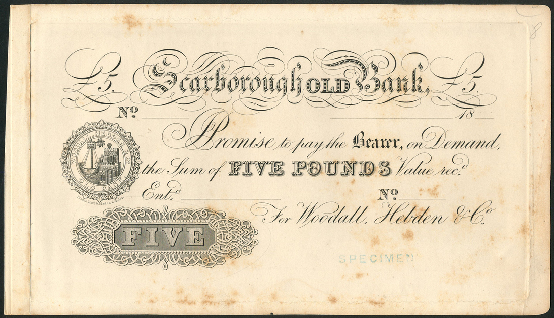 Scarborough Bank (Woodall, Hebden & Co.), proof £5 on card, 18- (1887-1896), black and white, arms at left