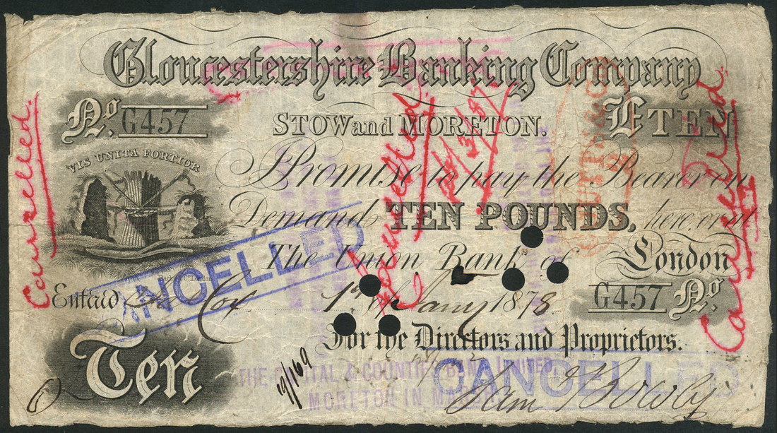 Gloucestershire Banking Company, £10, Stow and Moreton, 1 January 187[8], serial number G457, black and white, value at lower left, centre and top right, vignette of sticks bound by rope at left, manuscript signature of Sam Bowly at lower right
