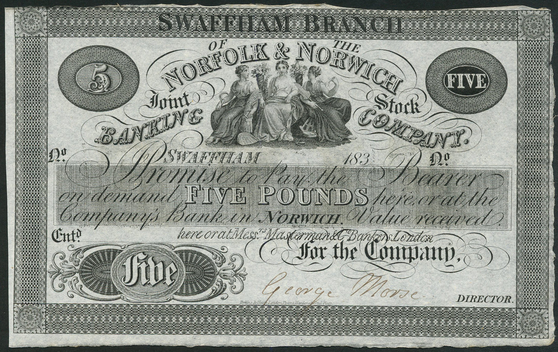 Norfolk and Norwich Joint Stock Banking Company, unissued £5, Swaffham, 183-, black and white, bank title top centre with three allegorical maidens below, value in oval tablets at top left and right and in ornate frame low left, manuscript signature of George Morse low right, reverse, value in large letters