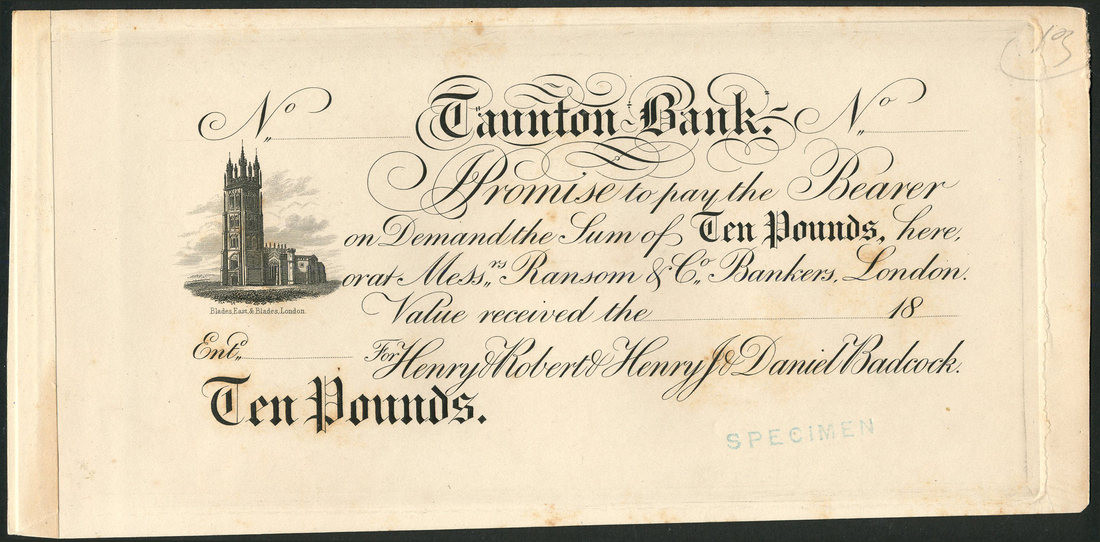 Taunton Bank (Henry, Robert, Henry and Daniel Badcock), an obverse and reverse proof £10 on card, 18- (ca 1846-1873), black and white, church top left, reverse grey, arms at centre, ornate engine turnings in field