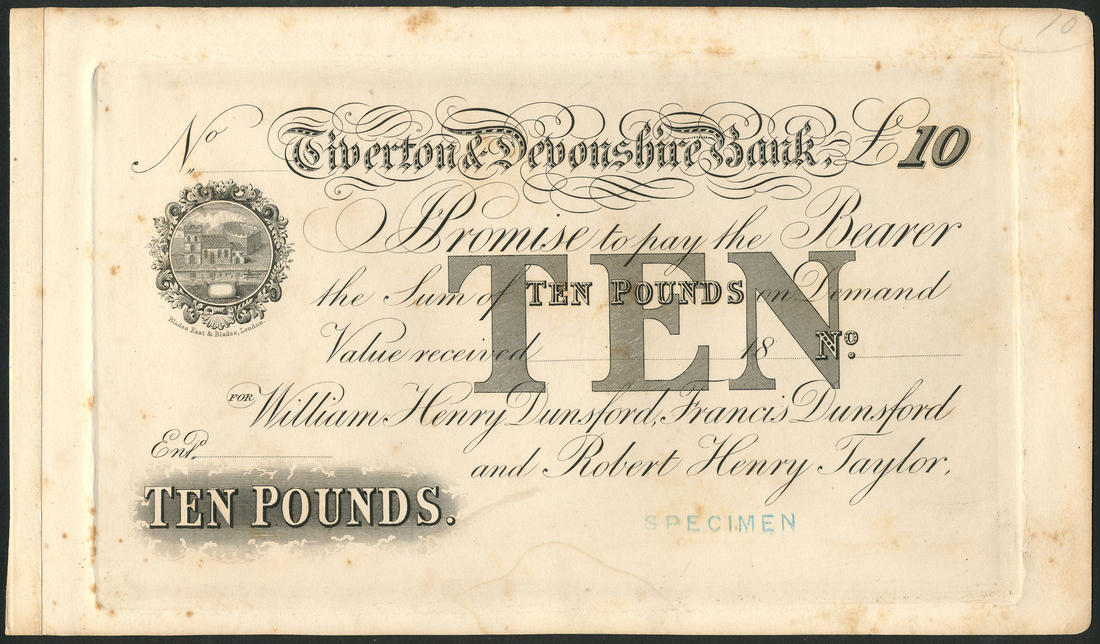 Tiverton and Devonshire Bank (William Henry Dunsford, Francis Dunsford and Robert Henry Taylor), proof £10 on card, 18- (c.1858-) , black and white with grey protector, buildings at top left in ornate frame, value low left