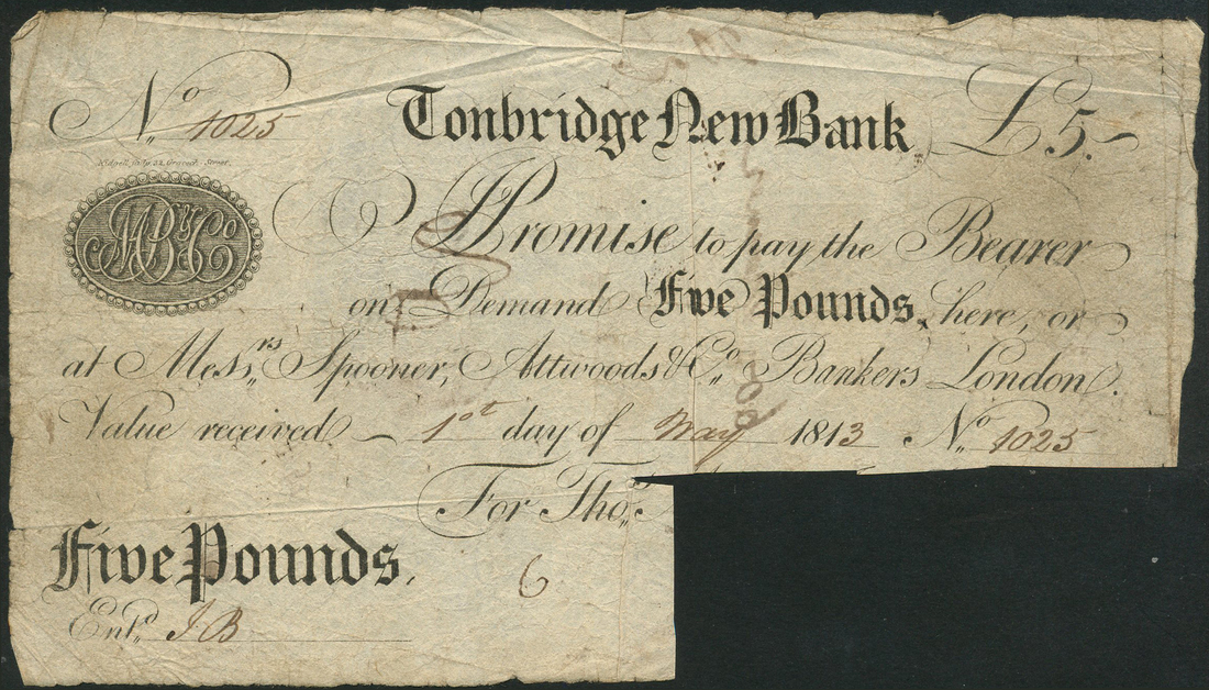 Tonbridge New Bank (Thos. Mercer, Jno . Barlow & Co.), £1, 23 August 1813, serial number 4820, and, £5, 1 May 1813, serial number 4025, both uniface, black and white, bank title top centre, partnership initials in oval tablet at left, partnership name excised