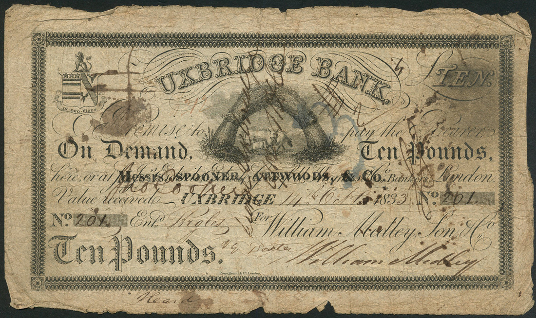Uxbridge Bank (William Medley, Son & Co.), £10, 14 October 1833, serial number 261, black and white, arms top left, sheep and corn sheaves at top centre, manuscript signature of William Medley low right