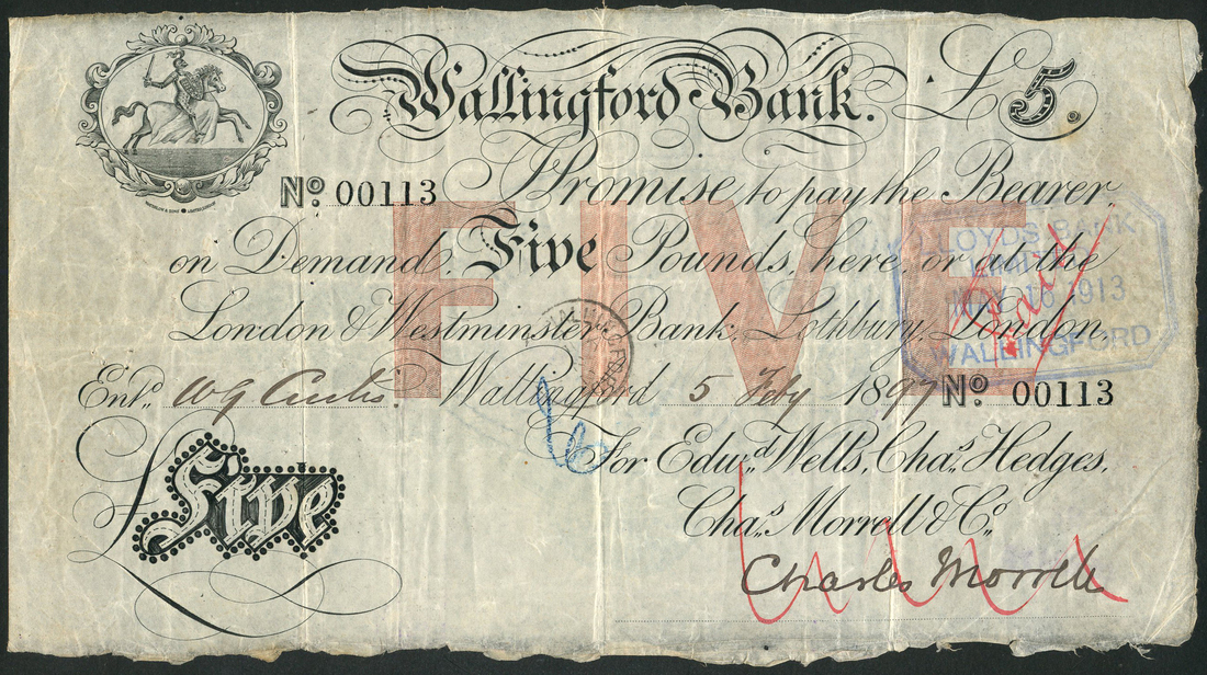 Wallingford Bank (Edward Wells, Charles Hedges, Charles Morell & Co.), £5, 5 February 1897, serial number 00113, black and white, value in pale pink underprint at centre, knight top left, manuscript signature of Charles Morrell low right, reverse blue-green, value and engine turnings