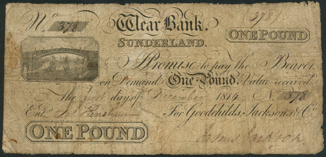 Wear Bank, Sunderland (Goodchilds, Jackson & Co.), £1, 1 December 1814, serial number 378, black and white, bridge top left, manuscript signature of Jackson low right