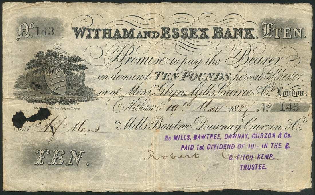 Witham & Essex Bank (Mills, Bawtree, Dawnay, Curzon & Co), £10, 19 March 1881, serial number 143, black & white, arms and oak tree, manuscript signature low right, reverse grey, arms at centre