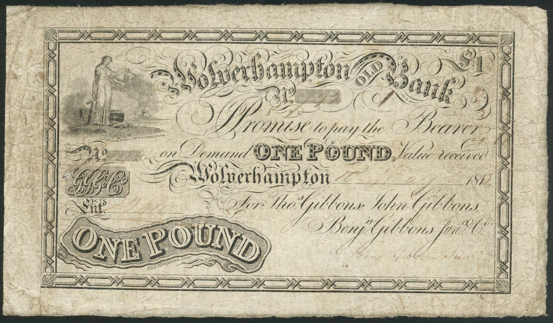 Wolverhampton Bank (Thos Gibbons, John Gibbons, Benjn Gibbons Junr & Co), £1, 1813, serial number 143, black and white, bank title top centre, allegorical female top left, partnership initials at left, R & E Williamson printing