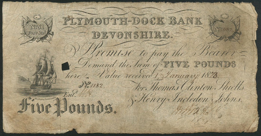 A group of provincial notes, comprising, Dartmouth General Bank (John Hine and Henry Joseph Holdsworth), £1 (2) 12 August 1822 and 19 April 1823, Stanford Spalding and Boston Banking Company, £5, 1901, Warwick and Warwickshire Bank, Greenway, Smith and Greenways, 5, 1887, Carmarthen Bank, Waters Jones & Co, £5, 1825, Norwich & Swaffham Bank, Thomas Starling Day, Henry F. Day & William Day, £1, date obscured, Christchurch & Wimborne Bank (Dean, Clapcott, Quartley & Co.), £1, 1825, Stockton on Tees Bank, (Jonathan Backhouse & Compy.), £5, 1879, Plymouth-Dock Bank, Devonshire (Thomas Clinton Shiells & Henry Incledon Johns), £5, 1823,