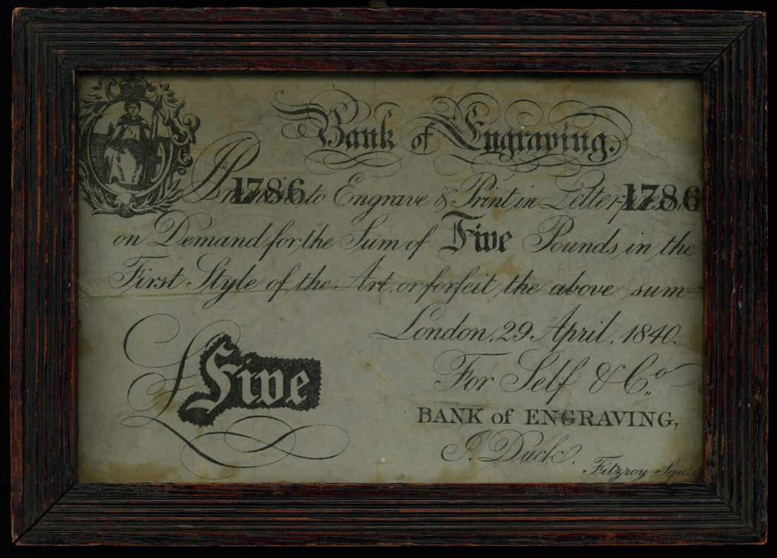 Bank of Engraving, £5, 29 April 1840, serial number 1786, black and white, Britannia top left, printed signature of J. Duck
