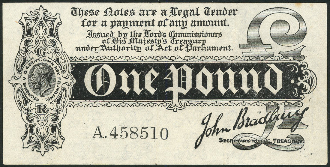 Treasury Series, John Bradbury, £1, ND (1914), serial number A.458510, black and white, head of George V at left, pound symbol at right, value in black panel at centre