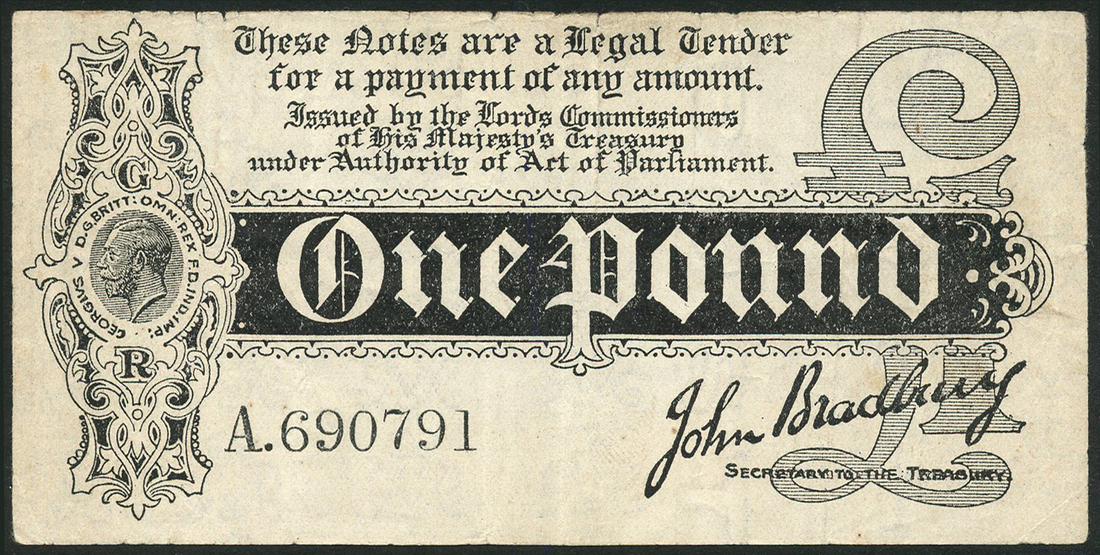 Treasury Series, John Bradbury, £1, ND (1914), serial number A.690791, black and white, head of George V at right, value in black tablet at centre