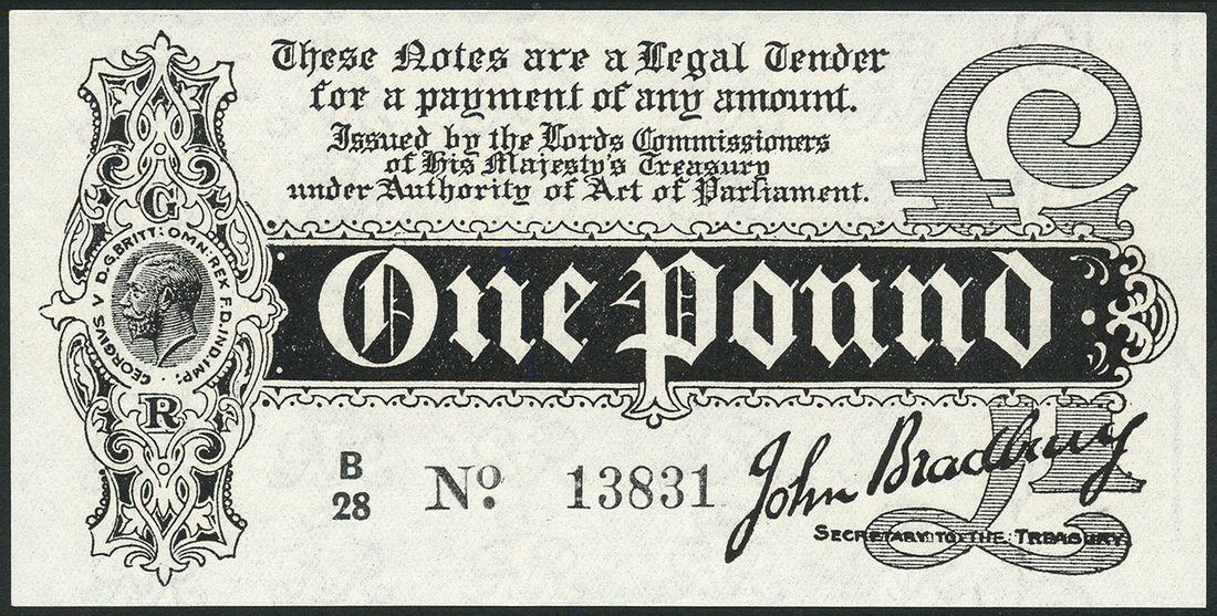 (x) Treasury Series, John Bradbury, £1, ND (1914), serial number B/28 13831, black, George V at left, value in tablet at centre and at right