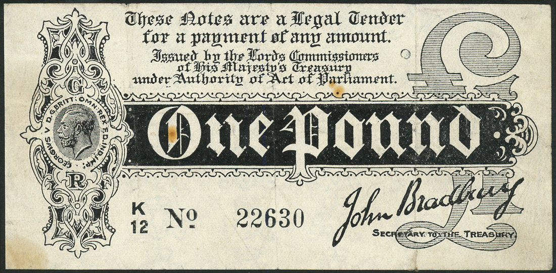 Treasury Series, John Bradbury, £1, ND (1914), serial number K/12 22630, black and white, head of George V at right, value in black tablet at centre