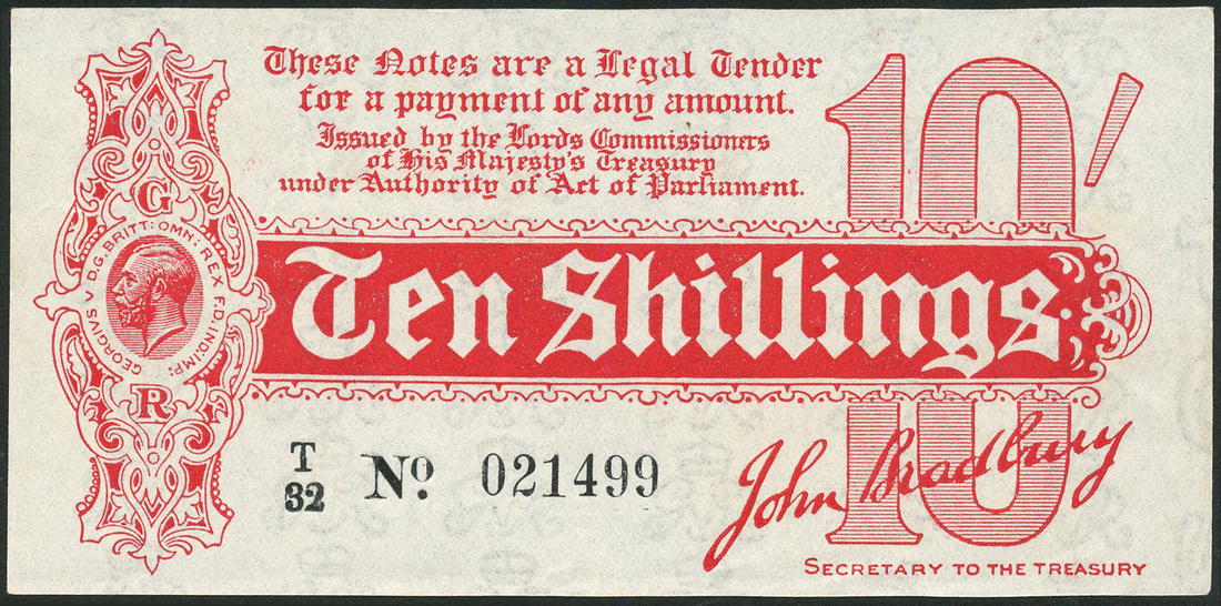 Treasury Series, John Bradbury, 10 shillings, ND (1914), serial number T/32 021499, red and white, head of George V at left, 10 shilling symbol at right, value in red panel at centre