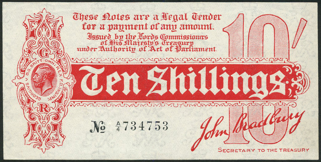 (x) Treasury Series, John Bradbury, 10 shillings, ND (1914), serial number A/4 734753, red, George V at left, value in tablet at centre and at right