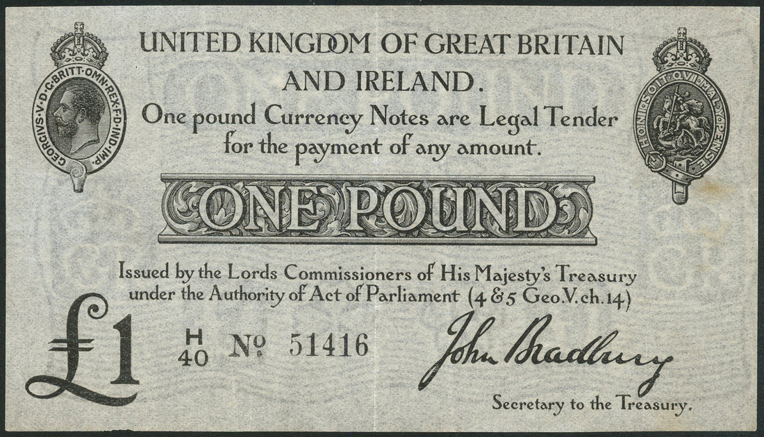 Treasury Series, John Bradbury, £1, ND (1914), serial number H/40 51416, black and white, head of George V at top left, arms top right, value low left