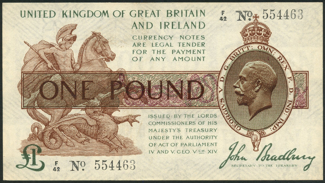 Treasury Series, John Bradbury, £1, ND (22 January 1917), serial number F42 554463, brown and green, crowned head of George V at right, St George and dragon at left, bank title top centre left, value in panel at centre left, reverse, parliament building