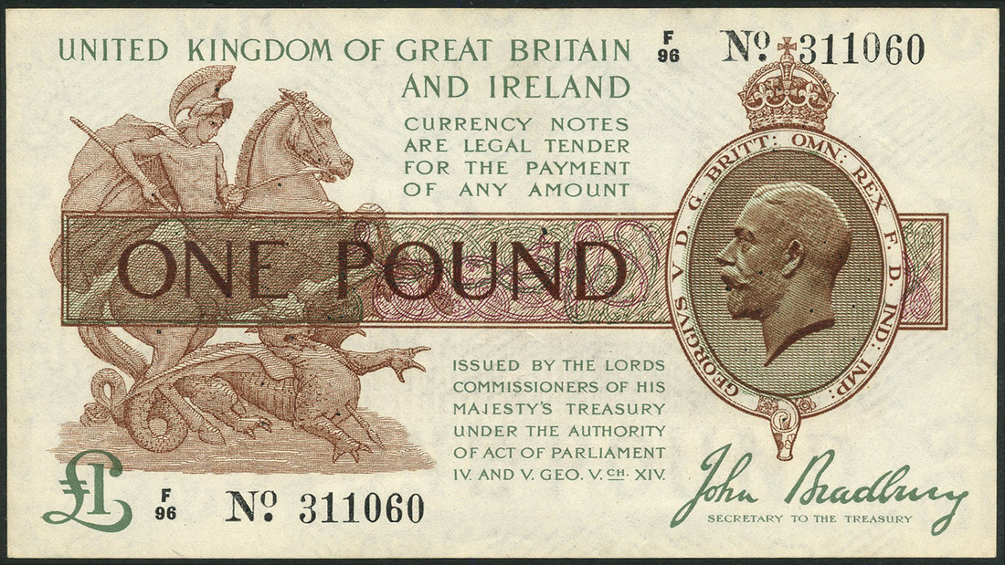 Treasury Series, John Bradbury, £1, ND (22 January 1917), serial number F96 311060, brown and green, crowned head of George V at right, St George and dragon at left, bank title top centre left, value in panel at centre left, reverse, parliament building