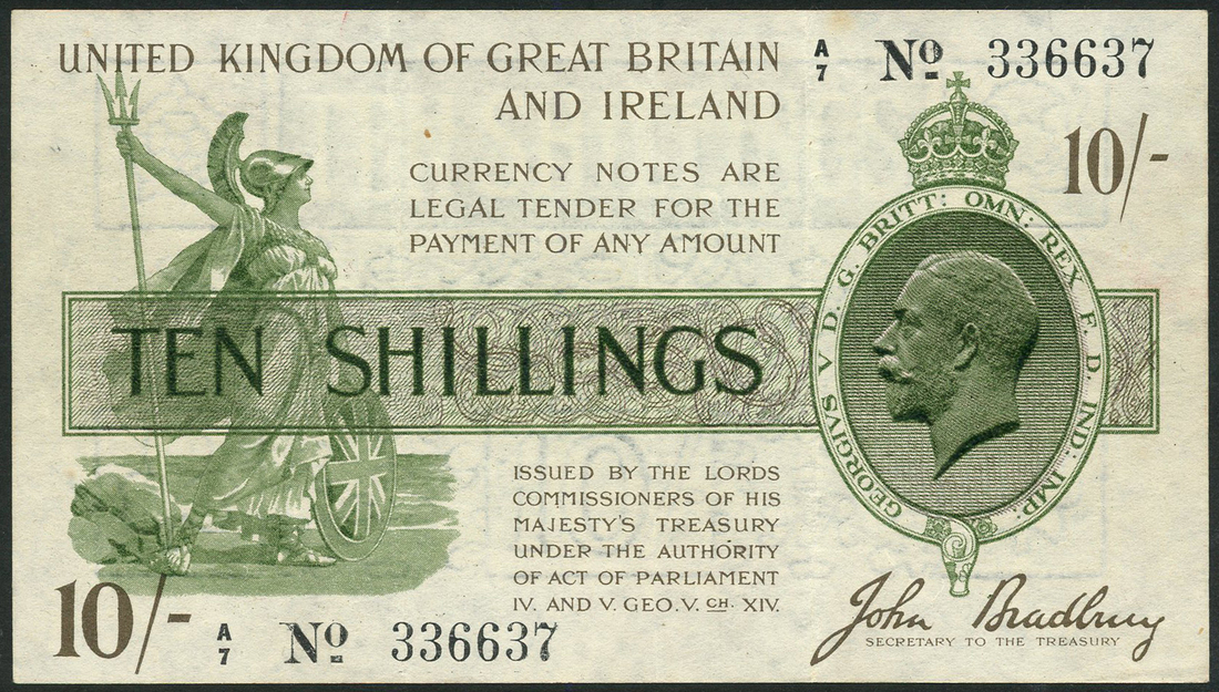 Treasury Series, John Bradbury, 10 shillings, ND (1918), serial number A/7 336637, dash, green, lilac and white, Britannia at left, crowned head of George V at right