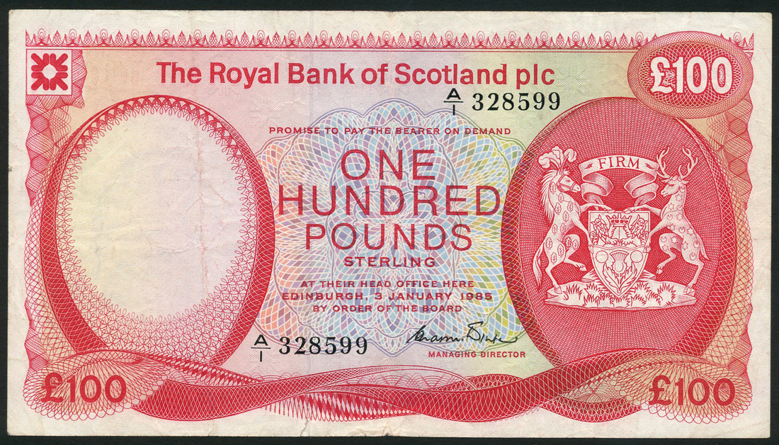 Royal Bank of Scotland Limited, specimen £100, 19 March 1969, serial number A/1 000000, red on multicolour underprint, bank title top centre, arms low centre right, Burke signature, reverse, Forth road and rail bridges, also, an issued Royal Bank of Scotland plc £100, 3 January 1985, serial number A/1 328599, red, arms at right, value in three corners and at centre, Winter signature, reverse, Balmoral Castle
