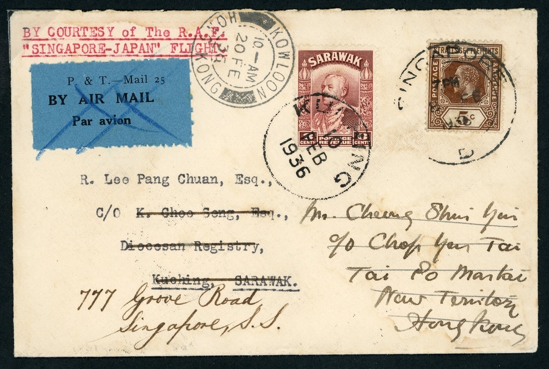1936 (8 Feb.) envelope to Kuching and re-addressed to Hong Kong and again back to Singapore, marked "By courtesy of the RAF "Singapore - Japan" Flight", bearing Straits 5c. tied by Singapore c.d.s. (8.2) and Sarawak 6c. tied by Kuching c.d.s. (10.2), showing Air Mail etiquette (crossed through), Kowloon c.d.s. (20.2)