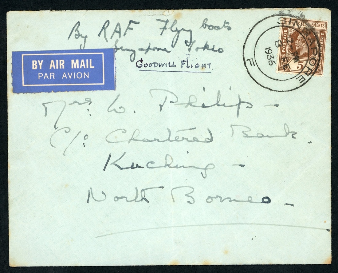 1936 (8 Feb.) envelope flown on the first stage to Kuching of the RAF Goodwill flight from Singapore to Japan, franked at 5c. and showing, on reverse, arrival datestamp (10.2); envelope with central fold