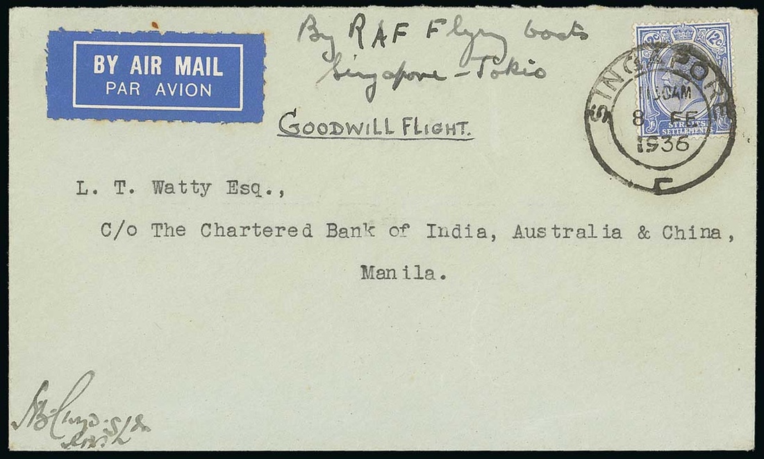 1936 (8 Feb.) envelope flown from Singapore to Manila, marked "By RAF Flying boat, Singapore-Tokio, Goodwill Flight", franked at 12c., signed by Squadron-Leader W.B. Lloyd at lower left and showing, on reverse, arrival datestamp for 13 February. Photo
