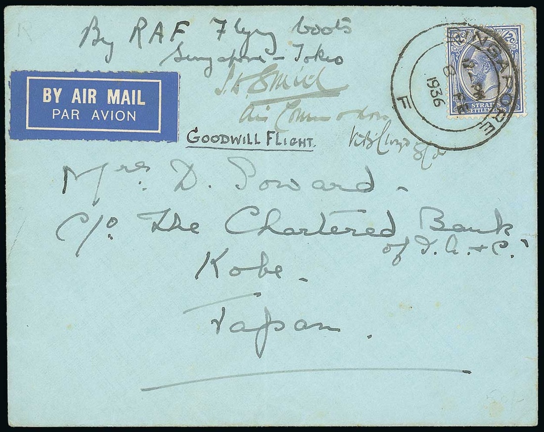 1936 (8 Feb.) envelope from Singapore to Kobe, flown to Shanghai and then taken by boat to Japan, marked "By RAF Flying boat, Singapore-Tokio, Goodwill Flight", franked at 12c. and signed by Squadron-Leader W.B. Lloyd. Photo
