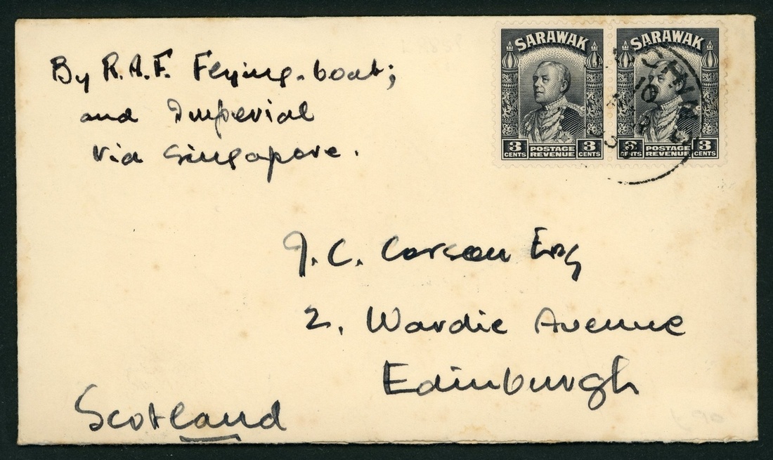1938 (10 Mar.) envelope addressed to Edinburgh, flown from Kuching to Singapore, marked "By RAF Flying-boat and Imperial via Singapore" and franked at 6c.; no transit or arrival markings