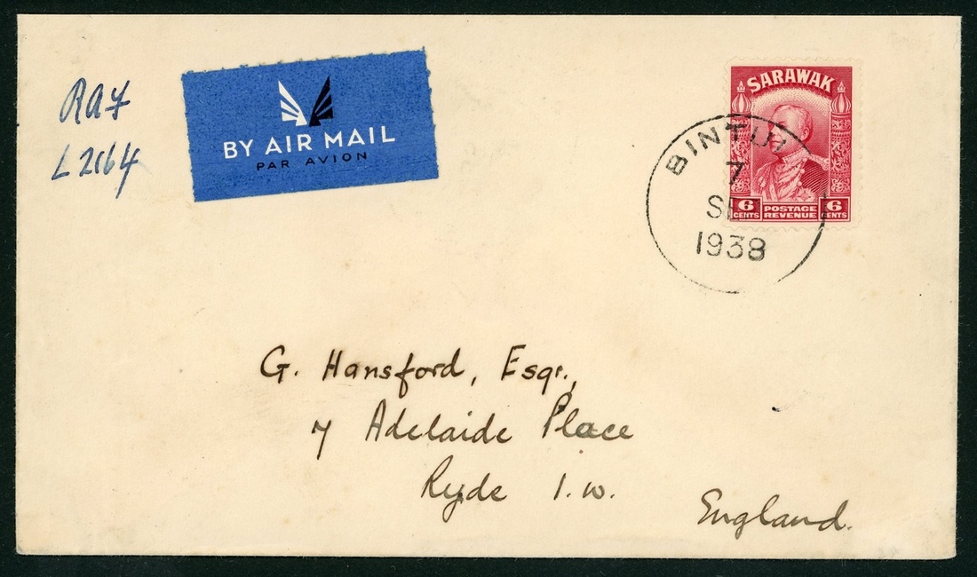 1938 (7 Sept.) envelope flown from Bintulu to Kuching, then Singapore and surface to England, marked "RAF L2164", franked at 6c. and showing, on reverse, Kuching datestamp (7.9)