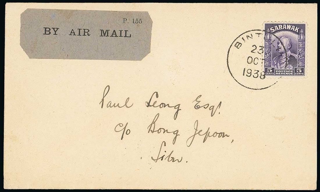 1938 (23 Oct.) envelope flown from Bintulu to Sibu, showing "by air mail" etiquette, franked at 5c. and showing arrival datestamp (23.10) on reverse. Photo